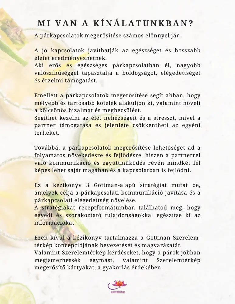 A kézikönyv 3 Gottman-alapú stratégiát mutat be, amelyek célja a párkapcsolati kommunikáció javítása és a párkapcsolati elégedettség növelése.