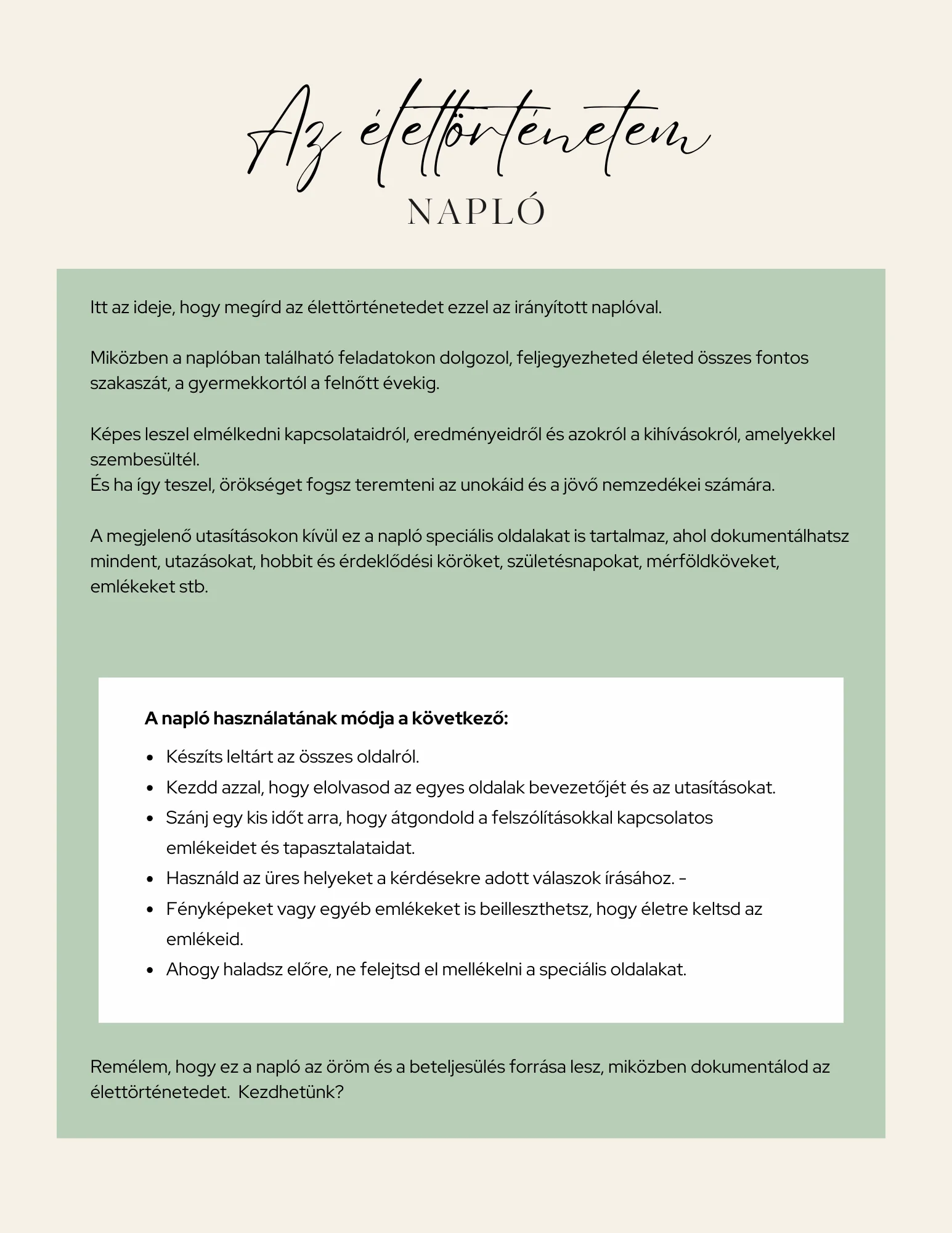 Miközben a naplóban található feladatokon dolgozol, feljegyezheted életed összes fontos szakaszát, a gyermekkortól a felnőtt évekig.